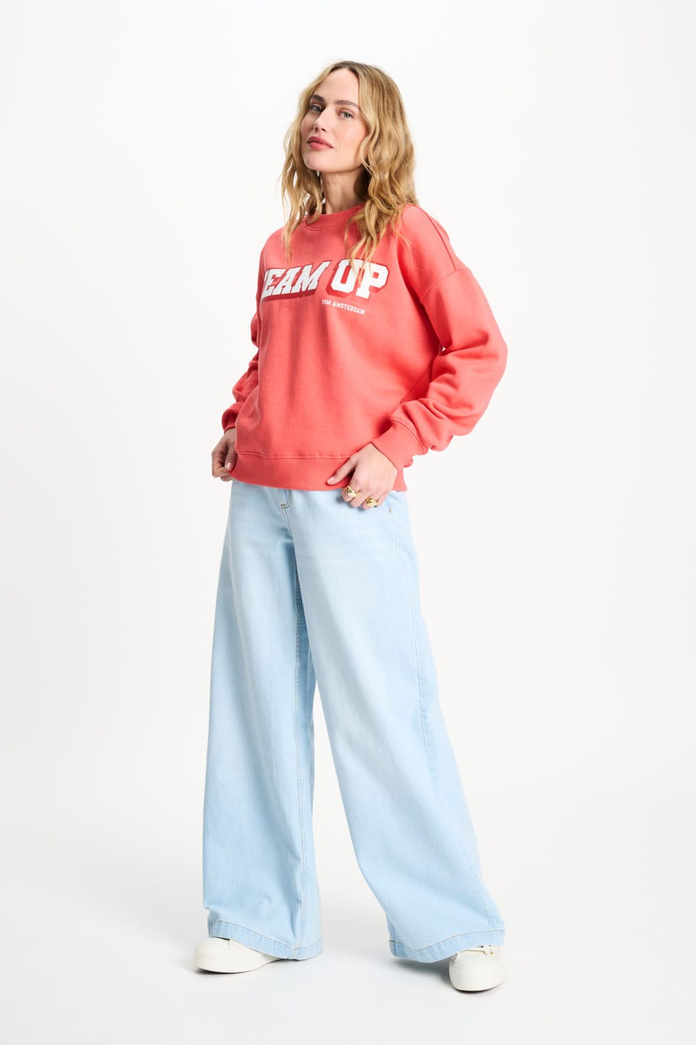 Der Pullover hat eine weite, boxy Passform mit langen Ärmeln. Das Model auf dem Foto ist 170 cm groß und trägt Größe 36.