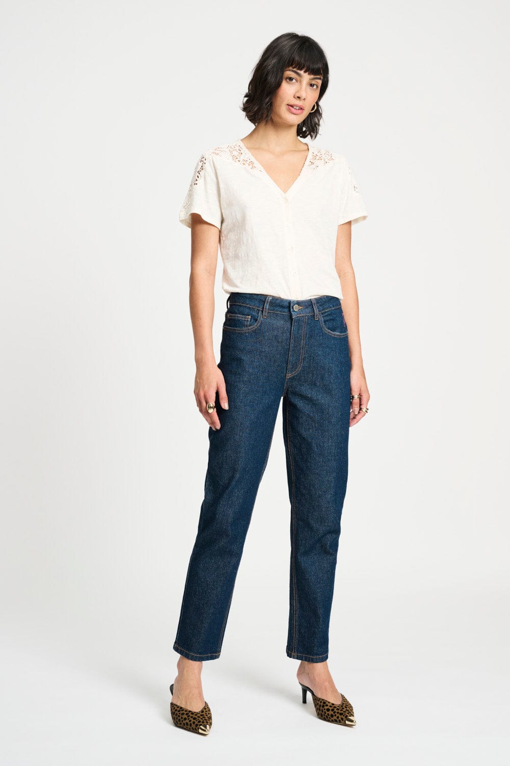 Das T-Shirt hat eine gerade Passform. Das Model auf dem Bild ist 175 cm groß und trägt die Größe 36.